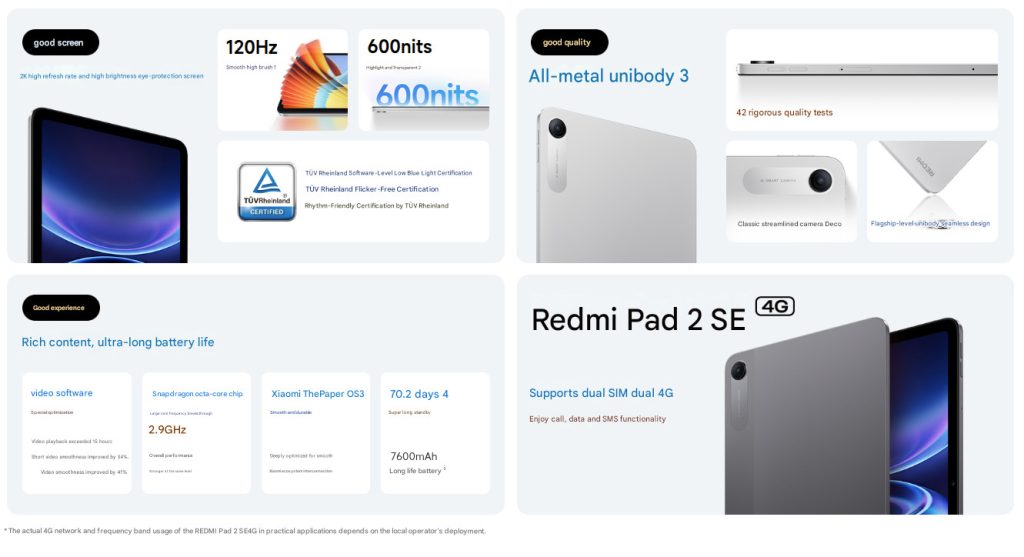 Xiaomi has introduced the REDMI Pad 2 SE in China, available in two versions: Wi-Fi only and Wi-Fi + 4G, along with the K90 Max smartphone. The tablet is slim and lightweight, measuring 7.4mm thick. It weighs around 406g, making it easy to carry around.