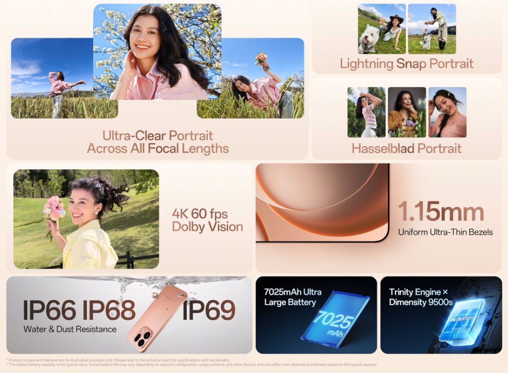 - 6.59-inch (2760 × 1256 pixels) 120Hz AMOLED display, 3840Hz ultra-high-frequency PWM dimming, up to 3600 nits peak brightness, Dolby Vision, Corning Gorilla Glass 7i Protection