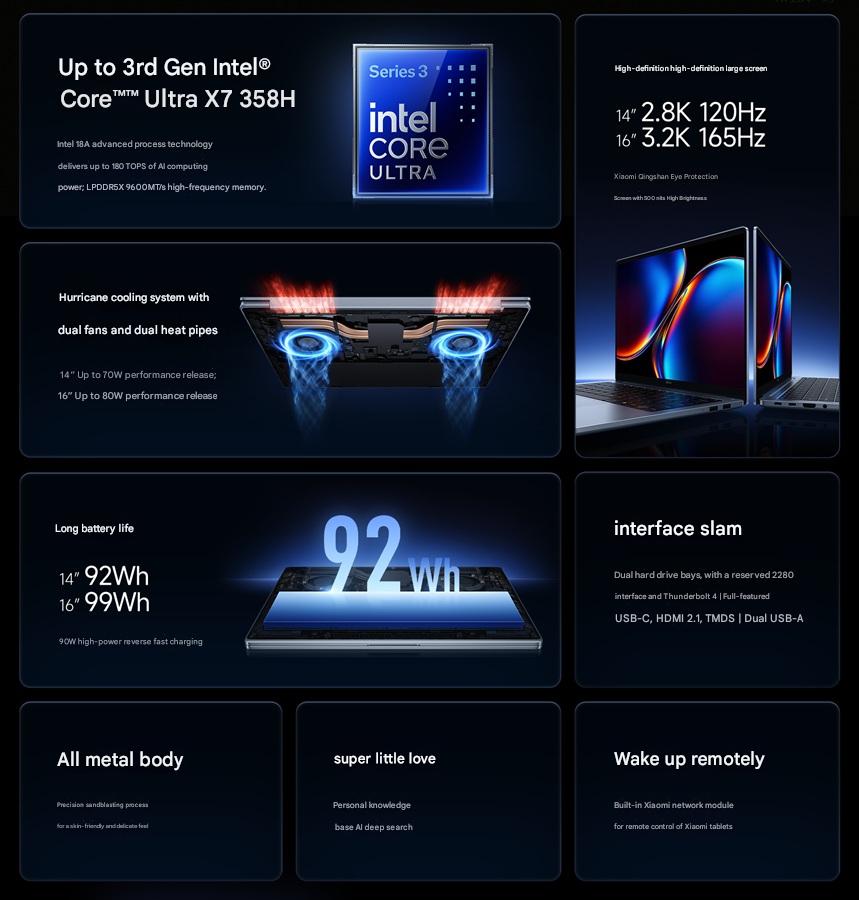 The laptops use Xiaomi’s Hurricane Cooling System, which combines dual 12V fans with long and short blades, dual 3mm heat pipes (D6 + D8), and an oversized heat dissipation plate with 40% more coverage than the previous generation.
