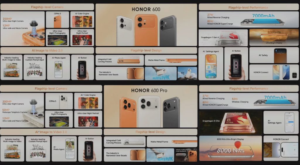 - HONOR 600: Powered by the Snapdragon 7 Gen 4 processor, offering 27% CPU and 30% GPU performance gains.
