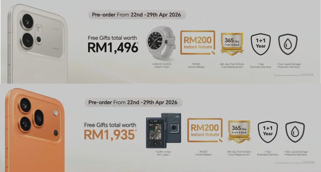 Pre-Order Details: Pre-orders run until April 29, 2026, across the HONOR Online Store, HONOR Experience Stores, official flagship stores on Shopee, Lazada, and TikTok Shop, as well as authorized retailers including Harvey Norman, Senheng, SenQ, and Urban Republic.