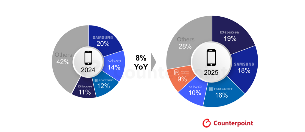 ‘Made in India’ manufactured smartphones grew 8% YoY in 2025, driven by a 28% surge in exports, which contributed to nearly one-third of India’s manufactured units, according to a recent study by Counterpoint Research. India-based Electronics Manufacturing Services (EMS) company Dixon is leading the chart with a 19% share and 89% YoY growth, owing to increased orders from Motorola, realme, and Xiaomi.