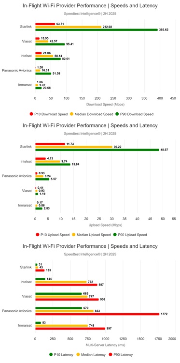 Starlink currently leads in both speed and consistency, creating a measurable gap between airlines that have adopted LEO-based connectivity and those that continue to rely on older systems.