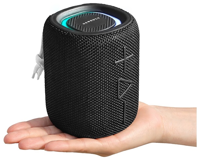 The Rave Q5 is a compact cylindrical speaker designed for portability with 360-degree sound output. It features a splash-resistant mesh fabric body, a utility loop, and top-mounted controls. It also supports TWS pairing for stereo output.