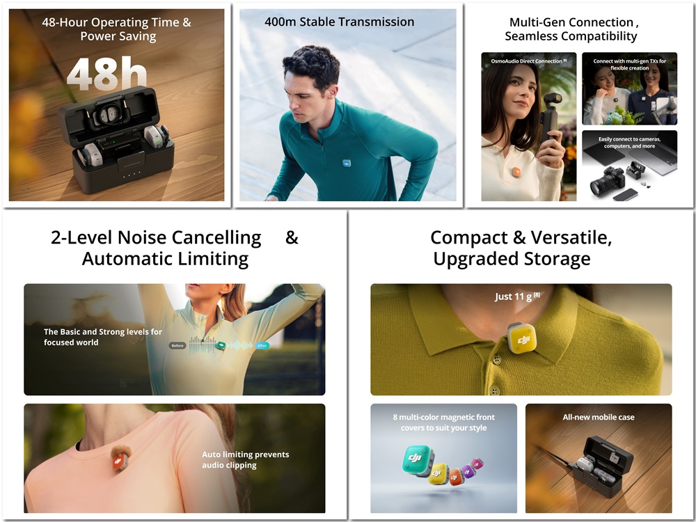 It combines flexible mounting, extended transmission range, ecosystem-wide compatibility, and efficient power management with fast charging and optimized battery usage, with up to 11.5 hours of transmitter life, 10.5 hours of receiver use, and up to 48 hours total backup with the charging case.