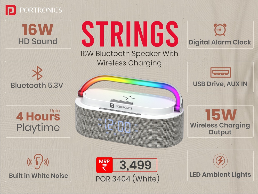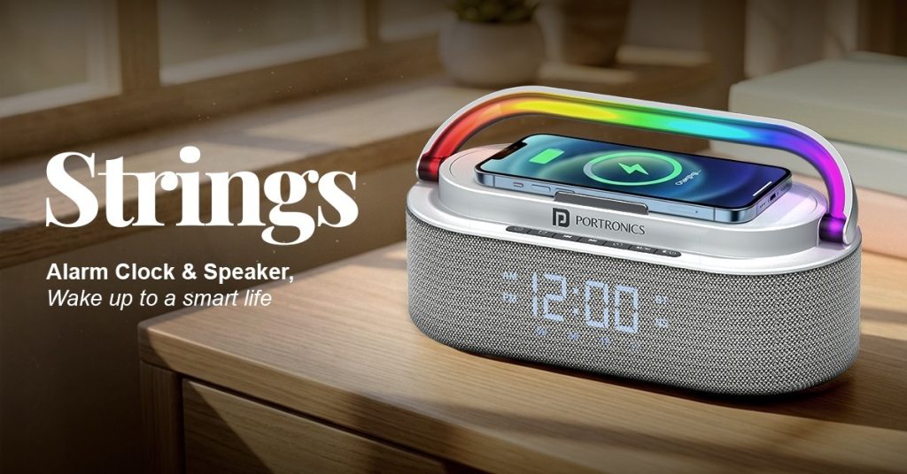 Portronics has launched the Portronics Strings, a compact bedside device that combines a speaker, wireless charging pad, alarm clock, and ambient lighting in a single unit.
