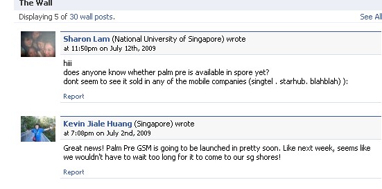 Singapore is expected to get the Palm Pre soon either this week or next as you can see from the facebook page below which was taken from a Pre community