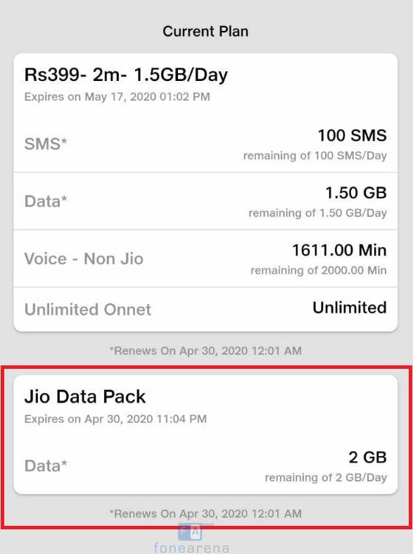 இலவச 2 ஜிபி தினசரி டேட்டாவை 4 நாட்களுக்கு மட்டும் செல்லுபடியாகும்.இது ஏப்ரல் 27, 2020 முதல் பயனர்களின் கணக்கை இலவச தரவுகளுடன் வரவு வைக்கத் தொடங்கியது. மேலும் இச்சலுகையை தனது ஜியோ பயன்பாட்டில் உள்ள ‘my jio ’ App மூலம் சரிபார்க்கலாம்.